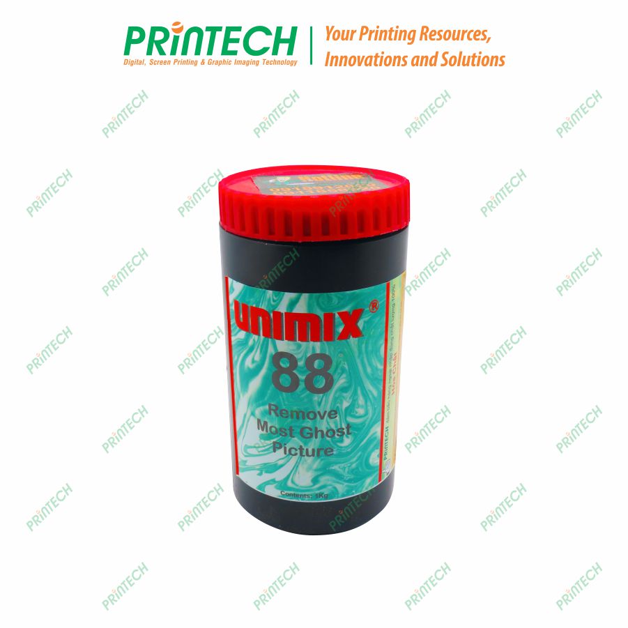 - UNIMIX 88 là hóa chất dạng bột nhão dùng để tẩy áng mực, chất màu, mực in bám trên bản in. Unimix 88 được sử dụng sau khi tẩy bản. Là hóa chất không độc hại, an toàn cho người sử dụng và thân thiện với môi trường. Hơn hết, sử dụng bộ đôi Unimix 55 và Unimix 88 cho chất lượng tẩy bản đạt tối đa.